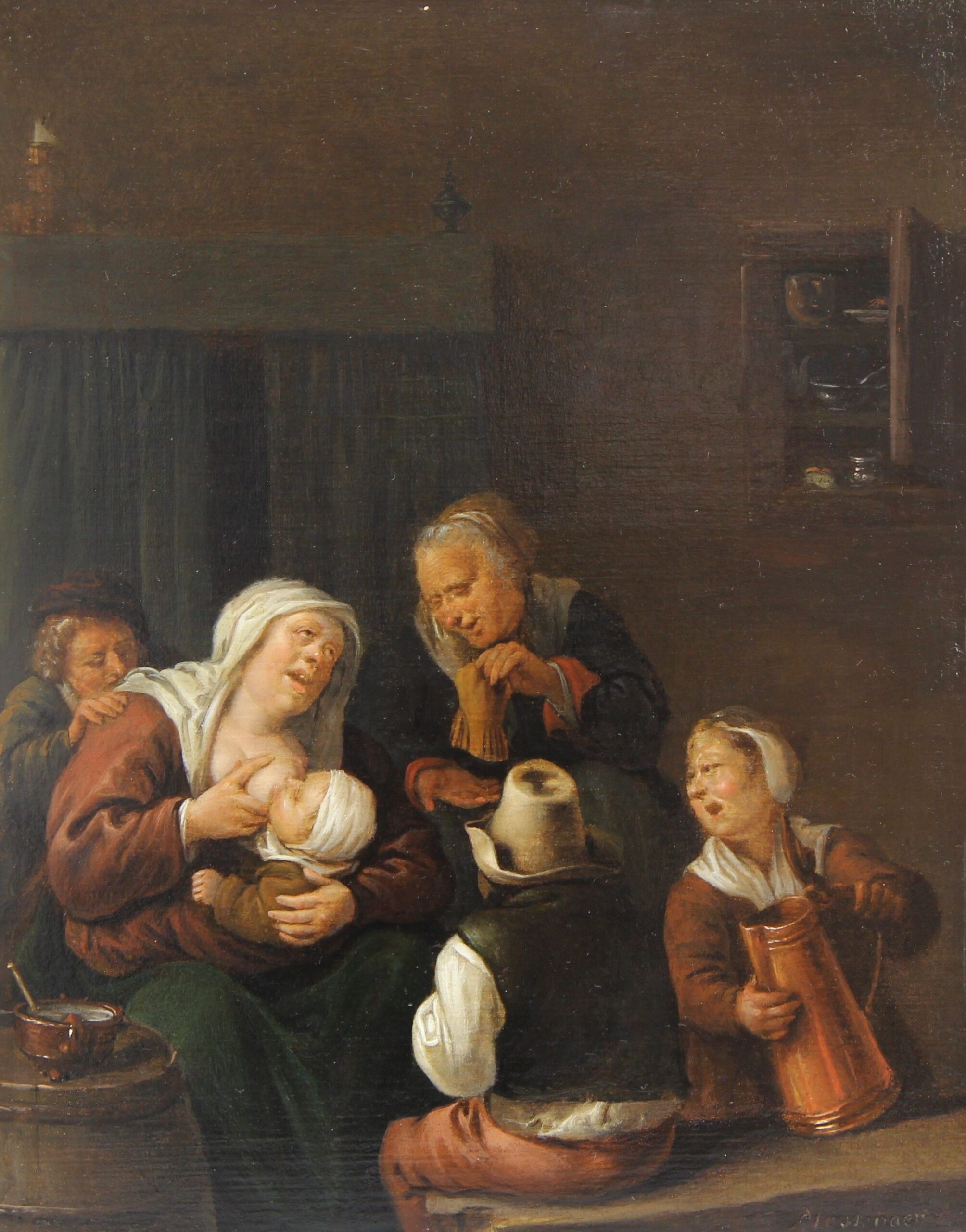 Gemälde, Öl auf Eichenplatte, Familienszene mit Kindern, unten rechts signiert „JMoolenaer“, 23,5 x 18,5 cm, um 1640, Collection Jules Porgés Paris, möglicherweise original gerahmt in flämischer Wellenleiste des 17. Jhd.