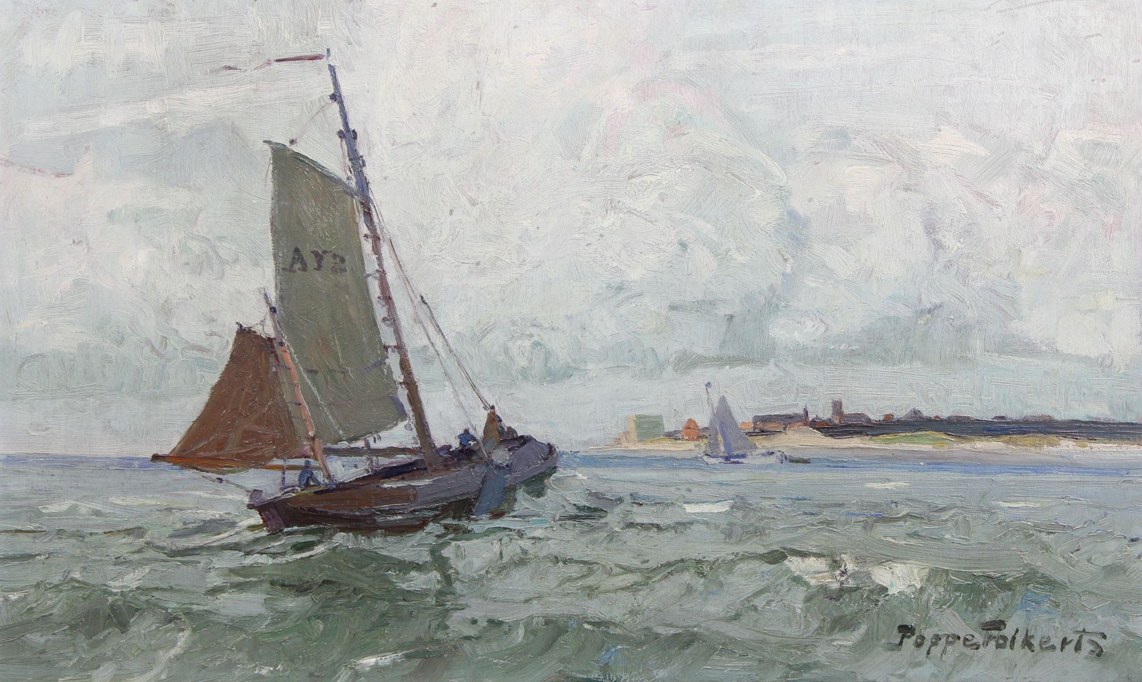 Auktion 61 Folkerts, Poppe (Norderney 1875 – 1949 Norderney) In unserer Herbst-Auktion Lot 61143 Gemälde „Segler vor Norderney“, Öl auf Holzplatte, unten rechts signiert „Poppe Folkerts“, 75 x 45,5 cm