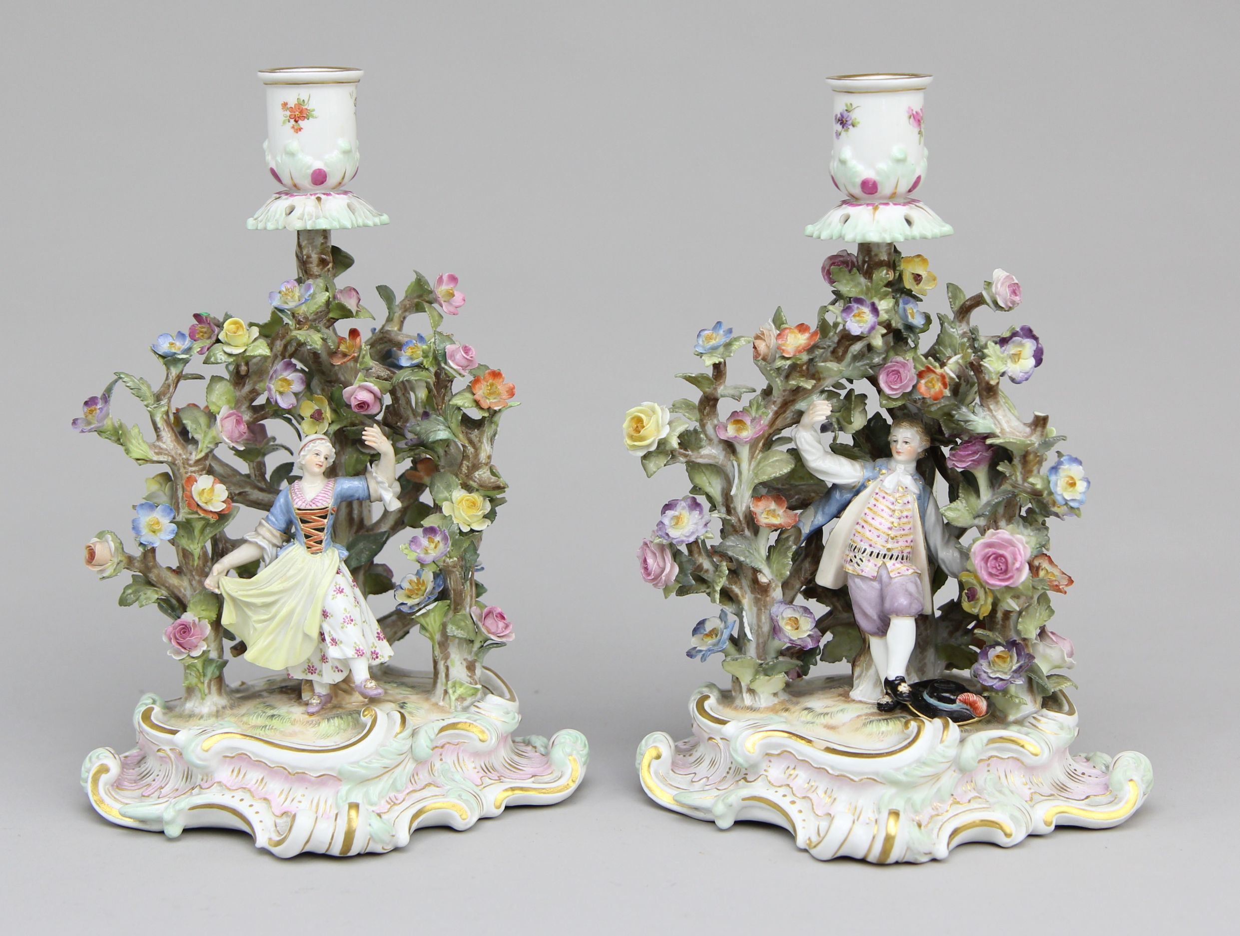 Auktion 61 Meissen – Leuchterpaar „Tanzpaar in der Laube“ In unserer Herbst-Auktion Lot 61232 Meissen 2. Hälfte 19. Jhd., beide Teile 1. Wahl, im Boden eines Exemplars altes Verkäuferetikett „T. GOODE & CO SOUTH AUDLEY SREET LONDON