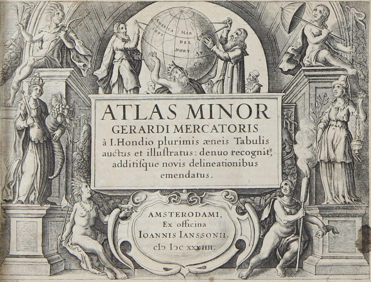 „Atlas Minor Gerhardi Mercatoris á I. Hondia plurimis aeneis Tabulis auctus et illustratus: denuo recognit additique novis deliationibus emendatus“ von Gerhard Mercator und Jodocus Hondius, 651 Seiten mit Titelkupfer und 142 Kupferstichkarten, 18 x 21 cm, lateinische Ausgabe 1634